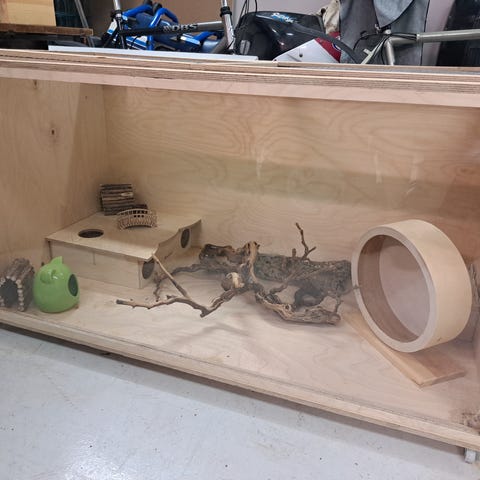 Terraario ollut hamsterilla käytössä ei todennäköisesti pidä vettä. terraarion koot pituus 100cm, leveys 35cm ja korkeus 40cm, mukaansa saa korokepalan joka on itsetehty(näkyy kuvassa 3.) Settissä tulee mukana puolikas purkki chinsillan pesuhiekkaa, 2kpl ruokakuppia, uusi vesipullo kaksi pussia purua ja porkkana puruleluja. Nouto Hankasalmelta.