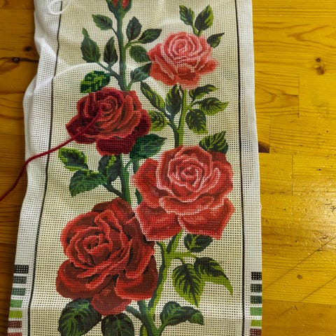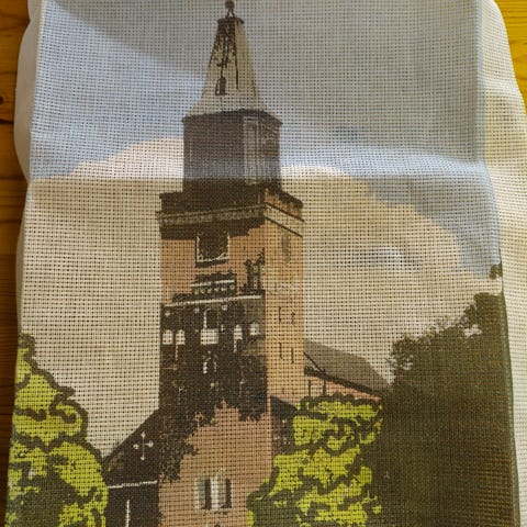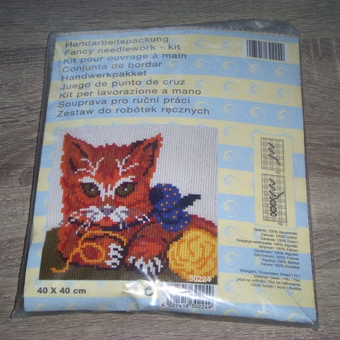 Kuvan kanavatyö, langat, neula kangas ja ohjeet. Koko 17 x 23 cm.
