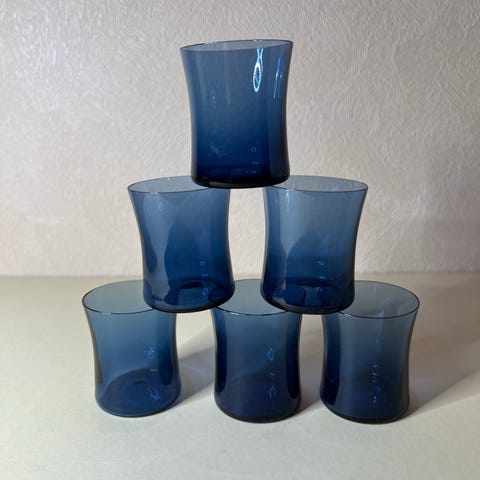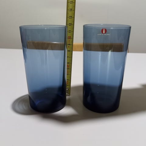 Timo Sarpanevan Ittalalle suunnittelemat I-104 juomalasit. Kolme sinistä ehjät, savun värisessä reunuksessa pitsku mikä tuntuu kynnellä. Hinta kaikille yhteensä