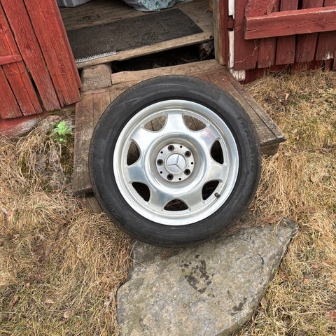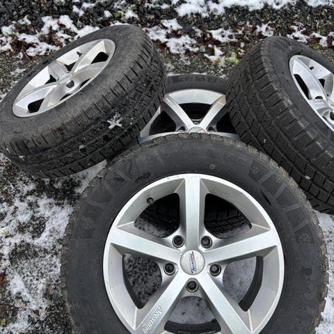 Michelin Latitude-kitkarenkaat vanteineen. 5-6 mm pintaa jäljellä. Nykynormit täyttävät renkaat.