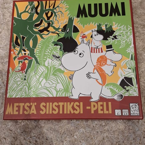 Muumi Noppahyppy lautapeli ( Kimbleä vastaava Muumi versio). 1 pelinappula puuttuu ja pahvilaatikossa käytön jälkiä.