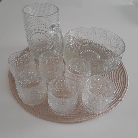 Riihimäen lasi, Nanny Stillin suunnittelema Grapponia iso kulho ja 6 kpl pieniä kulhoja, alkuperäisessä laatikossa, väri Amber.