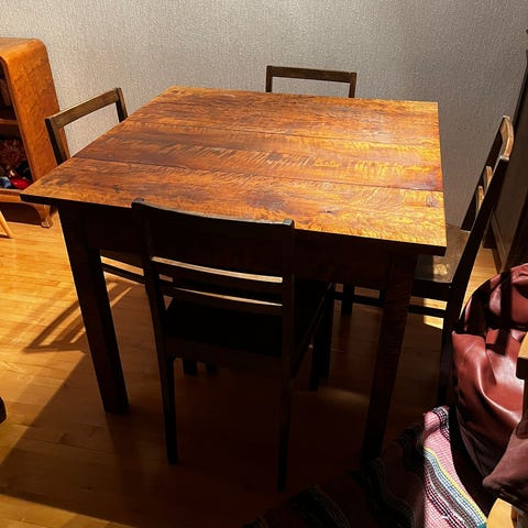 4 hengen pöytäryhmä, pöytä ilmeisesti jatkettavaa mallia. Pöydän pituus 140cm, leveys 96cm.