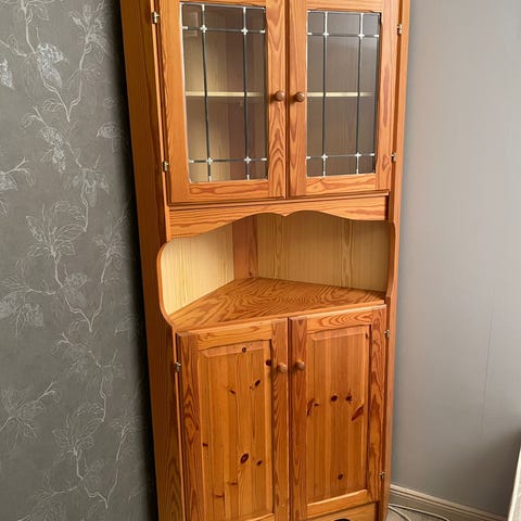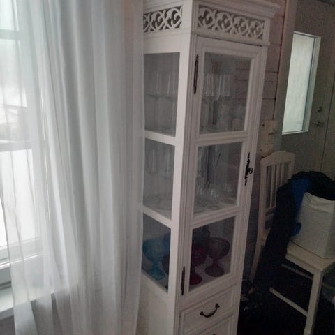 Ludvig vitriinikaappi, leveys 69,5cm, korkeus 164,5 cm, syvyys alarunassa 34cm. Korkeus 164,5 Väri antiikin valkoinen. Ludwig-tuotesarjan tuotteista todetaan niiden olevan pitkälle käsin valmistettuja, minkä vuoksi tuotteessa värierot, naarmut ja hiushalkemat ovat mahdollisia ja kuuluvat tämän sarjan luonteeseen. Tässä vitriinikaapissa on havaittavissa halkeamia tai naarmuja ja väri ei ole läheltä katsottuna tasainen. Vitriiniin mahtuu hyvin tavaraa ja hyllyt ovat tukevat. Laatikoissa muovistopparit takana ja laatikot kulkevat reunojen päällä.