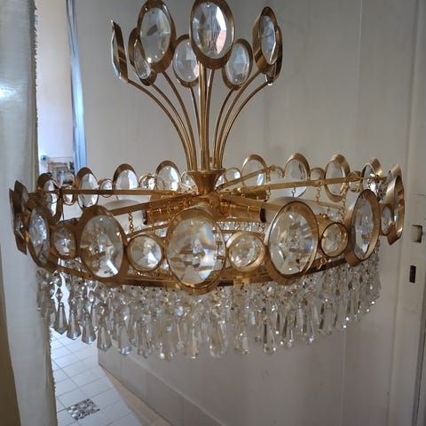 Messinkiä, 1970-luvulta. Viisi kellonmuotoista varjostinta, joissa prismaripustukset. Kokonaiskorkeus 140 cm.