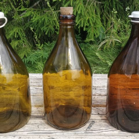 Kolme lasipulloa, joissa on eri värit: kaksi ruskeaa ja yksi vihreä. Pulloissa on korkit, ja ne soveltuvat esimerkiksi säilytykseen tai juomien tarjoiluun.