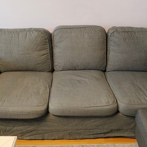 Valkoinen kolmen istuttava Ektorp sohva (katso mitat Ikean sivustolta).