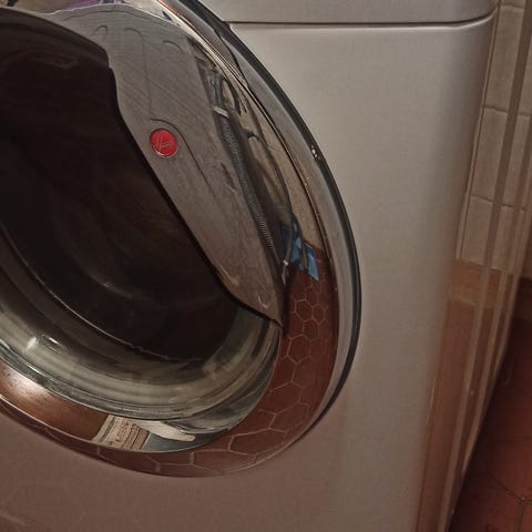 Hoover edestä täytettävä pesukone. Pesukoneessa on etupuolelta avautuva luukku ja digitaalinen ohjauspaneeli.