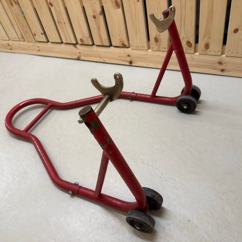 Moottoripyörän huoltopukki / säilytyspukki. Myös lankarullakiinnikkeet