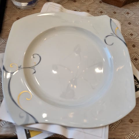 2 alkuruoka- ja 2 ruokalautasta. Kauniit kultauksella koristellut, sininen ja harmaa kuvioiset. Pienempi 22 cm, isompi 27 cm.