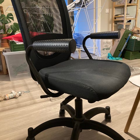 Hyvässä kunnossa oleva toimistotuoli. Wi suurta käytönjälkeä, olen myös juuri pessyt irroitettavan penkin päällisen. Uuden veroinen pientä kulumaa lukuun huomioimatta. Saa ylös ja alas, sekä selkänojan saa liikkumaan ees taas ja lukkoon.
