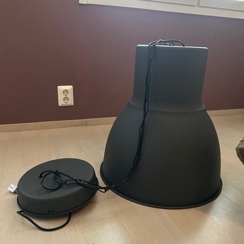 Myydään valkoinen Ikean Hektar kattovalaisin. Ketjua ja johtoa noin puoli metriä lisää korkeuden säätöön.