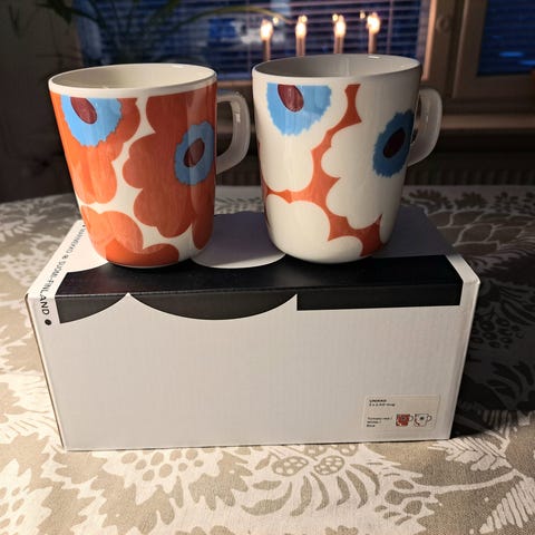 Myydään kaksi Marimekon Unikko mukia, väriltään beige ja valkoinen. Yksi muki on 4dl:n kokoinen ja pienempi kooltaan 2dl. Täysin käyttämättömät. Yhden mukin hinta 15€.