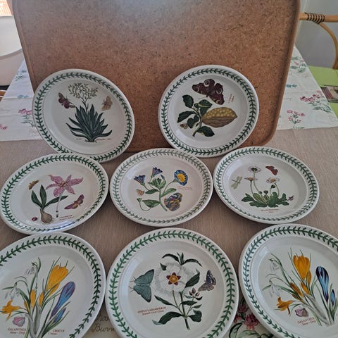 Käyttämättömät, täysin ehjät Pomona Portmerion lautaset neljä kpl 19 cm ja yksi syvä 22 cm. Muki 10,5 cm korkea.