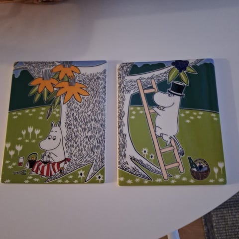 Myydään kuvan Arabian Muumi-laattataulut alkuperäispakkauksissa.