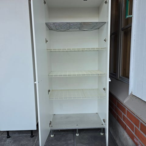 Kaksi erillistä kaappia (korkeus 42, syvyys 37, leveys 85, jalkojen korkeus 12) joissa toisessa jalat. Voidaan asentaa myös seinälle. Nouto mahdollisimman pian.