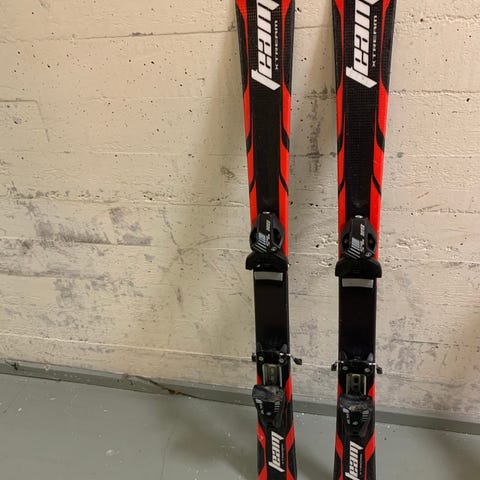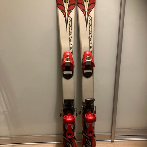 Hyväkuntoiset ja edelleen käyvät pelit lapselle rinteeseen. Pohjissa käytön jälkiä, mutta voitelun jälkeen liukkaat sukset edelleen.