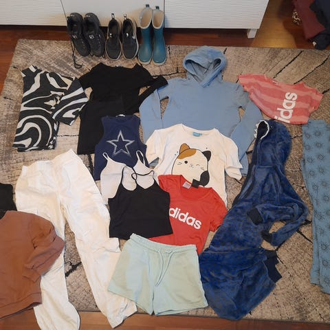 Tytär myy paljon monenlaista vaatetta isona pakettina; mekkoja, leggareita, housuja, t-paitoja, urkkavaatetta, tunikoita, sukkahousuja... kaikki eivät edes mahtuneet kuvaan. :)