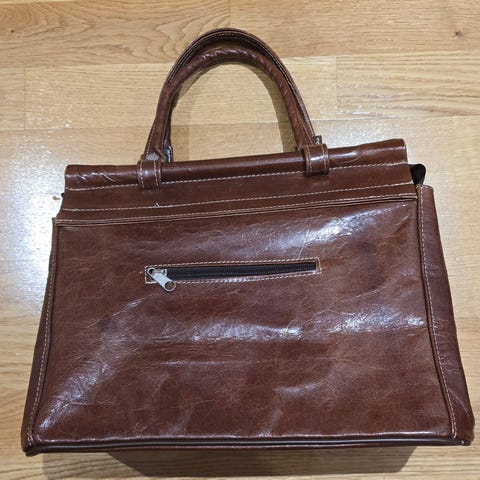 Vintage käsilaukku (kuvassa alla oik.) vuosikymmenten takaa, hyvin aikaa kestänyt. 3 pienempää taskua, 1 vetoketjullinen, 50e.
