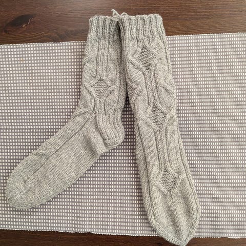 7 veljestä langasta käsin neulotut sukat, koko 42-43, harmaat. Kärjestä kantapäähän 28 cm, kantapohjasta varteen n. 77 cm.