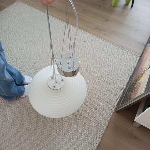 Korkeus säädettävissä, johtoa siihen noin 130 cm. Kuvassa valaisin roikkuu noin 70 cm katosta. Täysin toimiva ja valaisee hyvin.
