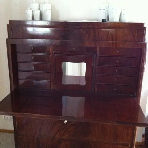 1900-luvun alkupuoliskon kaunis kirjoituslipasto "sekretär" intarsia kuvioinnilla. Lipasto on hyvässä kunnossa. Lipaston leveys on 84 cm, syvyys noin 38 cm ja klaffi avattuna kokonaissyvyys noin 54 cm ja korkeus 88cm. Kirjoitustason koko leveys 57 cm ja syvyys 36 cm.