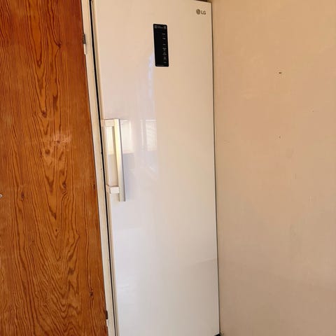 LG jääkaappi valkoisella värillä. Jääkaappi on suunniteltu kotitalouskäyttöön ja tarjoaa tilaa elintarvikkeiden säilytykseen. Laite on varustettu digitaalisen näytön ohjauksella ja energiatehokkaalla suorituskyvyllä.