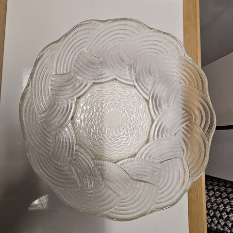 Kaksi lasista tarjoilukulhoa, kirkas väri, koristeellinen kuviointi. Sopii esimerkiksi pienten herkkujen tai salaattien tarjoiluun.