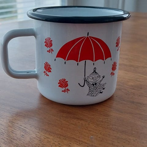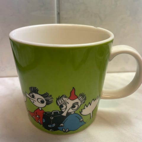 Muumi emalimuki pikkumyy. Sopii hyvin pieneen käteen, vetoisuus n.1,5dl. Muutamia kuvisss näkyviä kolhuja.