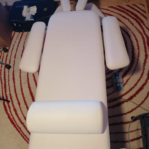 Jaccara hierontapöytä sinisellä verhoilulla. Pöytässä on säädettävät osat, mukaan lukien pääntuki ja käsinojat. Runkomateriaali on metallia, ja pöytä on suunniteltu ammattilaiskäyttöön hieronnassa tai fysioterapiassa. Mukana jalkatyyny ja paperiteline.