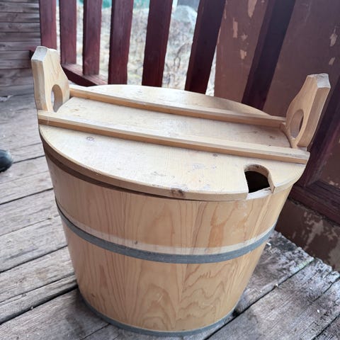 Saavin korkeus 35cm, halkaisija 39cm. Vaatii turvotuksen, niin saa kauniin ja vanteet pysyy paikoillaan.