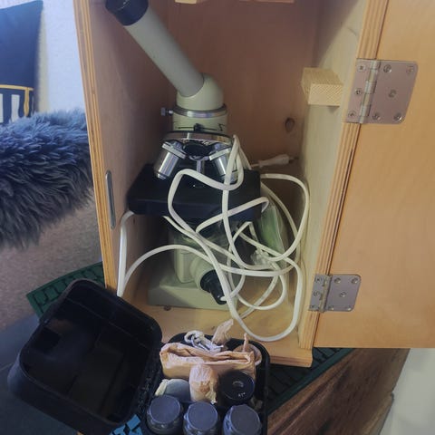 Leica merkkinen mikroskooppi, runko-ja linssit kunnossa, virtajohtoja poikki, virtalähteestä ei tietoa
