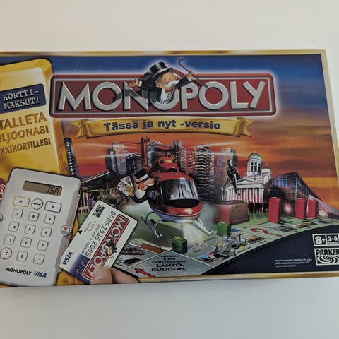 Myydään Monopoly Super Electronic Banking-lautapeli meille ylimääräisenä, kaikki osat tallella ja kaikki toimii kuten pitääkin. Muutamaan otteeseen pelattu, jonkin verran käytön jälkeä, esim. laatikon reunoissa hieman kulumaa.