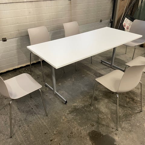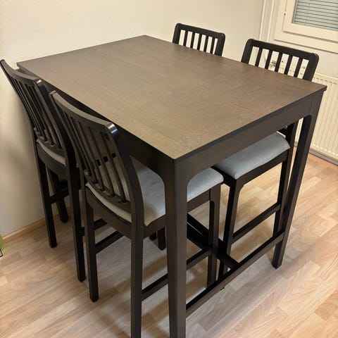 IKEA pöytä ja tuolit. Pöytä valkoinen, suorakulmainen. Tuolit mustat, puumateriaalia, tuolit harmaalla istuinpehmusteella.