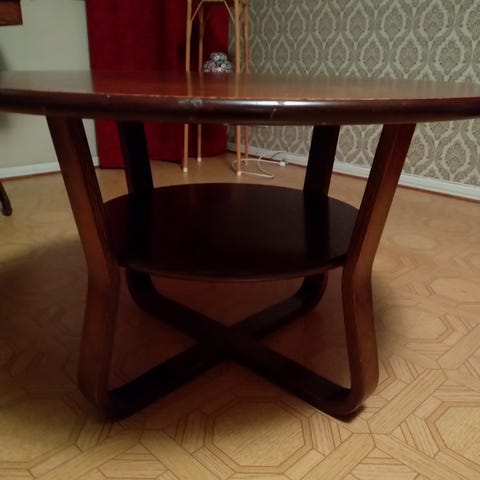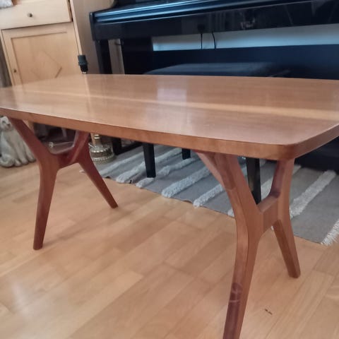 Pöydän reunat nousevat pyöreästi vähän ylöspäin. Tukeva pöytä en notku eikä nitise.