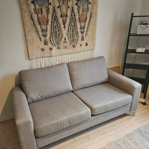 Sohva ylimääräisenä, hyvässä kunnossa ja jämäkkä istua.