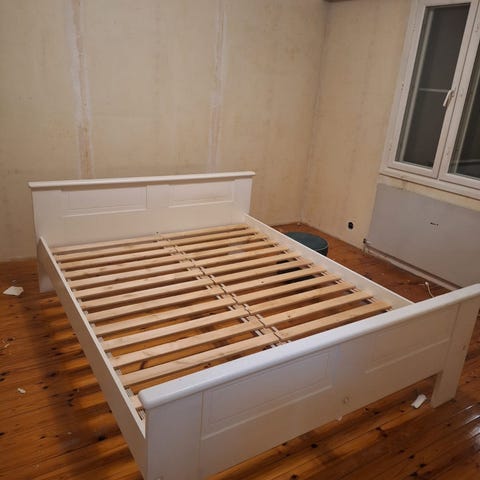 Rautainen valkoinen sänky kultaisilla koristeluilla. Valitettavasti osa koristeluista on kadonnut. Nähdään kuvasta. Hyvä kunto. Pohjarunko on puinen. Hinnasta voidaan neuvotella:)
