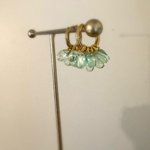 Vaaleanvihreät pienet annele-tyyliset lasipisara-korvakorut. Allergisoimaton kullanvärinen rengas.
