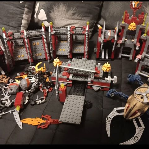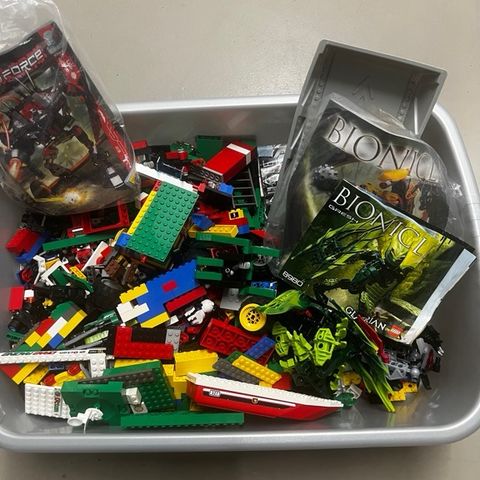 Sekalainen setti (puoli laatikkoa) LEGOja, jotain muuta vastaavia palikoita ja hahmoja. Mahdollisesti myös muita leluja kuten Bioniclen palasia.