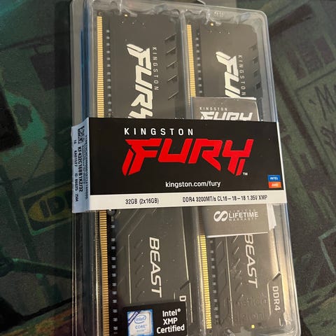 Kingston Fury DDR4 3600MHz 2x16GB (KF436C18BBK2/32). Jäänyt tarpeettomaksi koneen päivityksen myötä.