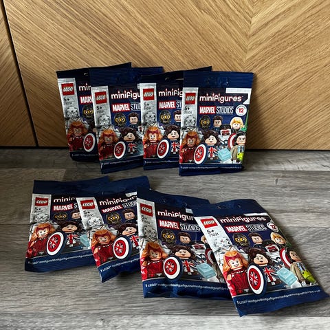 LEGO Marvel -minifiguurit, yhteensä 8 kappaletta. Mukana hahmot Batman, Spider-Man, Hulk, Superman, Hawkeye, Wolverine, Thor ja Captain America.