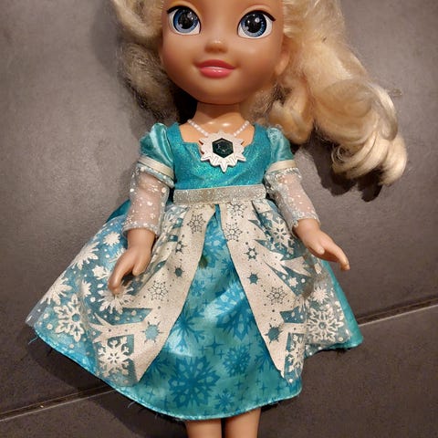 Myydään Frozen Elsa nukke, joka laulaa ja jossa valot. Mekossa vähän tahroja, pystyy pesemään. Korkeus 33 cm.