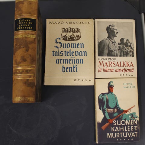 Hienoa salolaista maanpuolustushistoriaa! Massiiviset ja hyväkuntoiset kirjat, joissa toisessa kirjassa on historiaa ja toinen kirja on matrikkeli eli Salon seudun sotaveteraanien henkilöhistoriat. Historiakirjassa on 829 sivua ja matrikkelissa 1022 sivua.