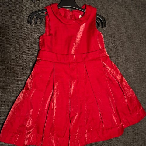 Punainen joulumekko, röyhelöhelma ja kimaltavat paljetit, velourpinta, koko 86cm.