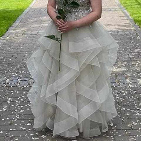 Ihana vaaleanpunainen wanhojentanssimekko. Tanssin itse wanhat vuonna 2020 ja tämä on silloin ostettu "Mecco" liikkeestä täysin uutena, eli käytetty vain kerran. Olen 160-162cm pitkä ja tanssin matalilla kengillä. Vaikea arvioida kokoa mutta veikkaisin olleeni tanssiessani noin S kokoa. Kuvat joissa mekko päälläni ovat luonnonvalossa, joten niistä näkee parhaiten sävyn.