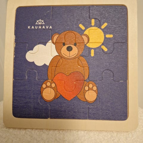 Lasten palapeli, jossa maatilan eläinten kuvia. Palapelin palat ovat puisia ja niissä on pieniä kahvoja helpottamaan käsittelyä lapsille.