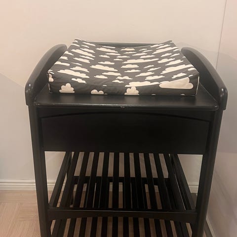 Pinta on käytön jäljiltä hieman kulunut ja naarmuuntunut, kuten kuvissa näkyy mutta siisti yleisilmeltään yhä. Halutessa saa hoitopöytään sopivan hoitoalustan (käytetty, laadukas, pestävä ja pyyhittävä päällinen, harmaa jossa valkoisia pilviä). Ei hajuja, aina sisällä säilytetty. Tukeva puinen. Ei ole säilytetty kylppärissä.