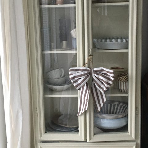 Uniikki, käsin koristemaalattu lasikaappi mukikokoelman säilytykseen.