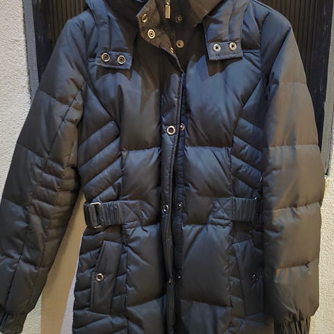 Espritin beigen valkoinen himmeän hohtava untuvatakki kokoa 36. Super pehmeä ja lämmin takki jossa iso kaulus joka käy hupusta. Todella upea päällä! Kultainen vetoketju ja vyön solki.