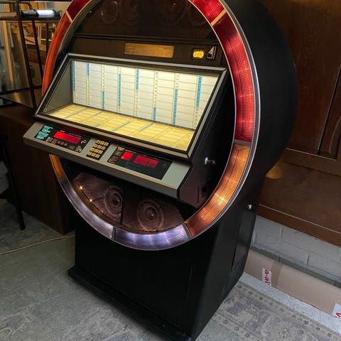 Tämä vanha jukebox, mahdollisesti 1930-luvulta peräisin, on todellinen aarre! Laite on seisonut käyttämättömänä lämpimässä varastossa vuosikymmeniä, ja sen toimivuutta ei ole vielä testattu. Suosittelemme huollon tekemistä ennen käyttöönottoa. Ulkopinnat ovat siistissä kunnossa, kuten kuvista näkyy. Jukeboxin laatassa komeilee teksti "Musiikki Automaatti Oy Kauttua - Puhelin Eura 130". Tämä ainutlaatuinen esine on saatavilla vain noudettavaksi. Osta tämä nostalgian täyteinen jukebox ja luot ainutlaatuisen tunnelman kotiisi tai vaikka baariin!